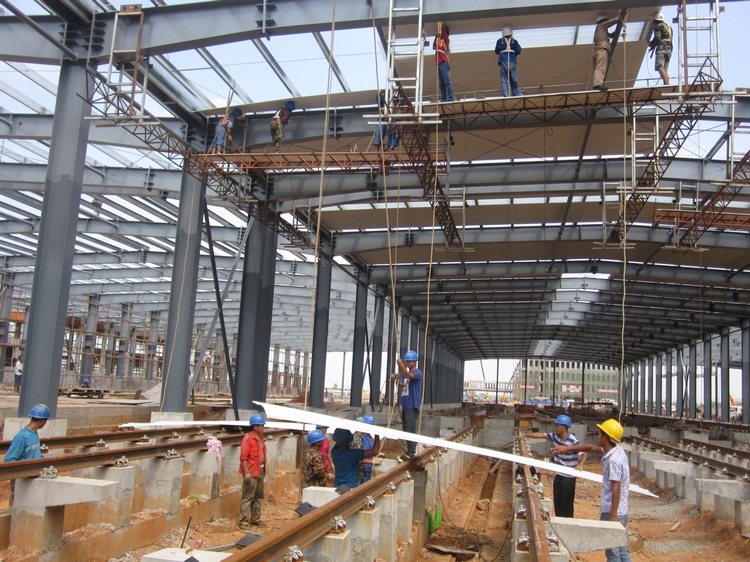 為確保施工節(jié)點工期,順利完成工程收尾攻堅階段,公司堅持緊密圍繞施工的各項指標,以“搶工期、保安全、保質(zhì)量、控造價”為目標,從嚴管理,強力推進,不遺余力的搶工期抓進度。目前的工程重點是運用鋼結(jié)構(gòu)、土建工程以及三個門衛(wèi)房,至今形象進度鋼結(jié)構(gòu)的鋼柱鋼梁已全部完成,檁條安裝完成80%,屋面安裝完成了40%。由于天氣炎熱,鋼構(gòu)件的溫度可謂是“燙手”,大大增加了白天安裝的難度;運用庫道床基礎(chǔ)基本完成,目前正在進行附屬用房的砌體工程,與幾方的交叉作業(yè)是其施工難點;門衛(wèi)房是常規(guī)的鋼筋混凝土結(jié)構(gòu),但門衛(wèi)房一的一層含分部夾層,建筑高度為11.4m,建筑面積為313.26㎡;門衛(wèi)房二、門衛(wèi)三(一層)建筑高度為4.3m,建筑面積為48.64㎡,都屬于異形結(jié)構(gòu),施工難度系數(shù)較高。另外還有邊坡防護、圍墻等分部工程同時進行。