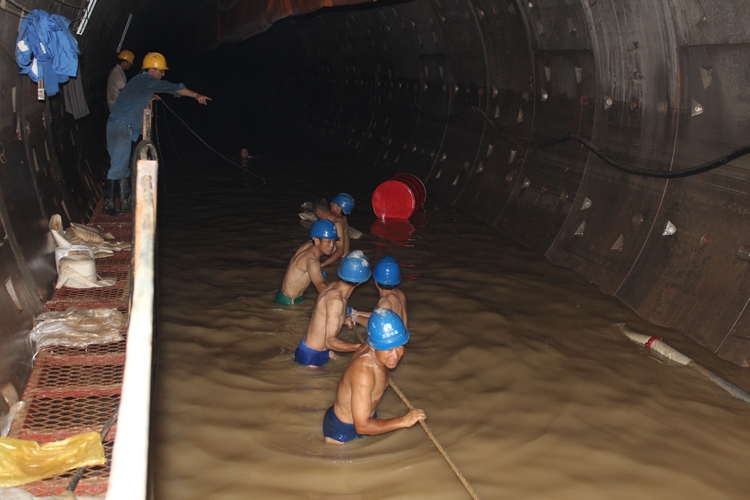 7月7日災(zāi)情發(fā)生后,玉龍路地鐵東段頭井基坑積水?dāng)?shù)米深,項(xiàng)目部立即投入排水搶修工作,集團(tuán)公司董事長(zhǎng)胡紅勝親自帶隊(duì)搶險(xiǎn),抽調(diào)十余臺(tái)大型抽水泵、25噸泵車(chē)到施工現(xiàn)場(chǎng),項(xiàng)目經(jīng)理及現(xiàn)場(chǎng)管理人員一人負(fù)責(zé)一臺(tái)抽水泵的拼裝,綁鐵絲、擰螺絲,自己動(dòng)手,公司總經(jīng)理王智高、支部書(shū)記王繁親自安排抽水泵下井工作,經(jīng)過(guò)三十多個(gè)工人三天的艱難搶險(xiǎn),終于將隧道中積水排出,一個(gè)星期后成功搶救出被淹沒(méi)的盾構(gòu)機(jī)。之后盾構(gòu)維修人員不畏艱難,跟泥土和水災(zāi)作戰(zhàn),將一個(gè)個(gè)零件拆下來(lái)進(jìn)行清洗檢修,公司還從海瑞克公司專門(mén)聘請(qǐng)兩名專職技術(shù)人員現(xiàn)場(chǎng)指導(dǎo)維修,電氣系統(tǒng)更換配件,重新調(diào)試,液壓系統(tǒng)也送到專業(yè)維修機(jī)構(gòu)進(jìn)行清洗維修,一個(gè)多月里解決了一個(gè)又一個(gè)難題,終于將盾構(gòu)機(jī)修好,具備再次始發(fā)的條件。