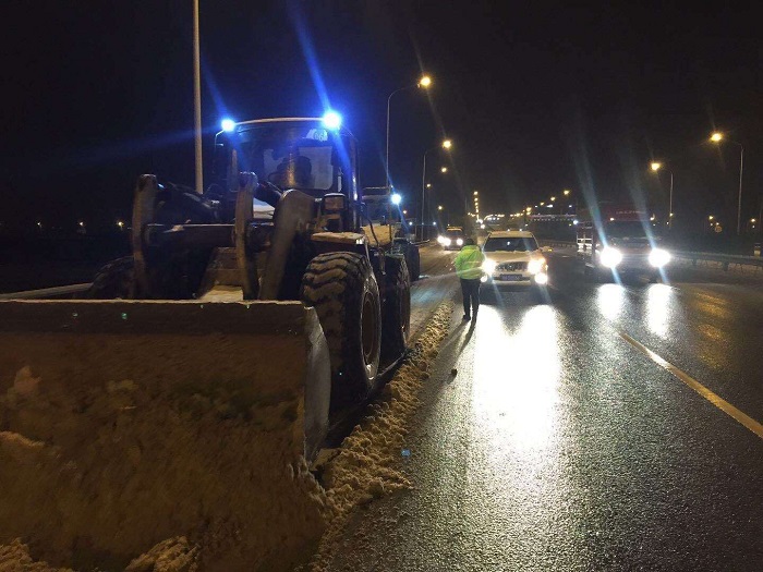 時間來到27日晚上23時,在三環(huán)線白沙洲大橋——國博大道路段,漢陽市政鐘鑫公司的搶險隊伍在漢陽市政集團副總經理、鐘鑫公司董事長方紫微的帶領和指揮下,克服白天一整天抗雪搶險的疲憊感,緊急調度機械設備和搶險人員,連夜前往搶險路段奮戰(zhàn)3小時,在寒冷冬夜順利完成了搶險任務。
