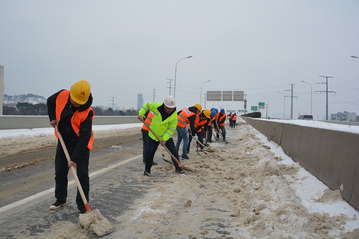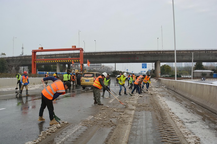 時間來到28日上午8時,在三環(huán)線百威路—長豐橋路段,鐘鑫公司迅速調度六大項目部150人和鏟車、農用車數臺,集體前往三環(huán)線高架進行除雪破冰。8點鐘的三環(huán)線高架,格外清冷,最低溫度甚至達到了零下6度!可是當你置身于搶險現場時,卻完全感覺不到寒意——只因為大家全身心的投入到搶險工作中,一把把鐵鍬揮舞得那么有力,一條條產雪破冰后的路面是那么干凈整潔,現場氣氛是那么的熱烈。期間更是迎來了漢陽區(qū)委書記馬澤江、漢陽市政集團公司董事長嚴悌文等領導來到搶險現場指揮工作,為正在搶險的“鐵軍”們鼓勁加油,大家干勁更足了,精神更振奮,最終在下午13:30將三環(huán)線百威路—長豐橋路段路面積雪清掃完畢。