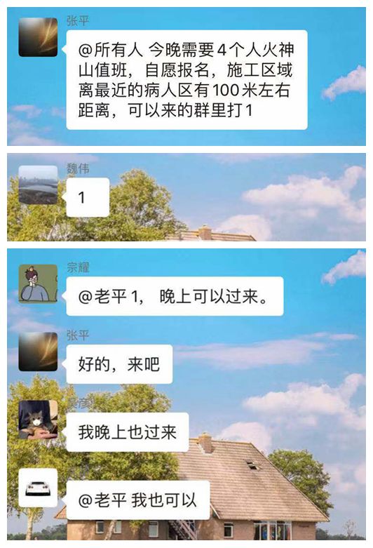 就在一線人員集中隔離之時,2月9日晚,從前線傳來需要人員留守夜班執(zhí)勤的緊急消息,在這個離隔離病房最近僅有50米的區(qū)域,危險無處不在。來不及考量,也來不及思索,“我可以”、“我過來”、“+1”的消息瞬間在工作群刷屏,參與火神山建設(shè)后正在隔離中的鐘鑫建設(shè)者紛紛響應(yīng),報名參加,選擇與危險同行、與責(zé)任相伴,以責(zé)任擔(dān)當(dāng)詮釋了什么是“最美建設(shè)者”。“沒有什么累不累,哪里需要我,我就站在哪里”“在這種關(guān)鍵時期,能貢獻(xiàn)一份力量就必須站在前面,我們做的是為了盡早打贏這場疫情阻擊戰(zhàn)”,舍生忘死、沖鋒在前,他們用最美逆行踐行著保家衛(wèi)國、抗擊疫情的錚錚誓言。