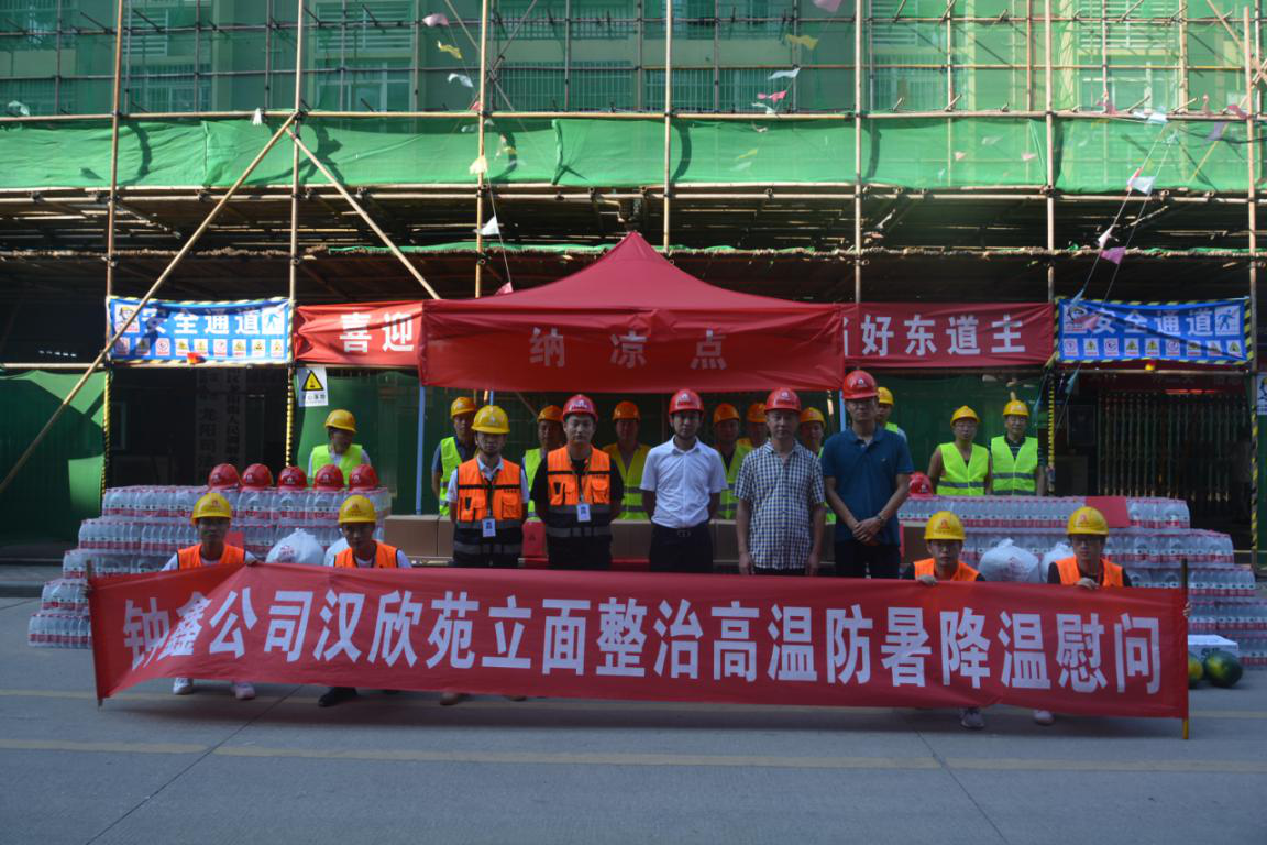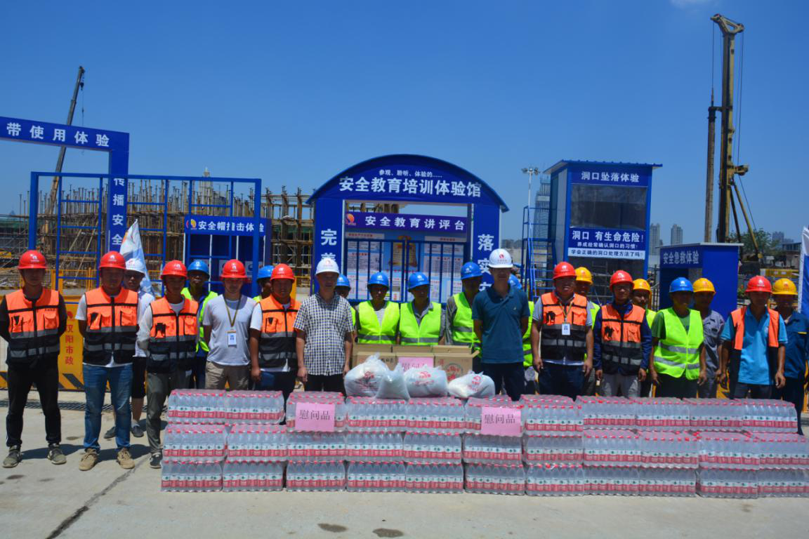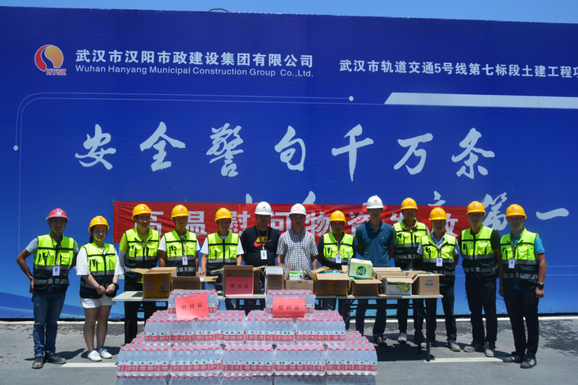 ? ? 酷暑來襲!近日,武漢頻頻發(fā)布高溫橙色預(yù)警,天氣炎熱干燥,公司領(lǐng)導(dǎo)十分牽掛一線作業(yè)人員的健康安全。為做好防暑降溫工作,加強高溫天氣下勞動作業(yè)保護,2019年7月26日上午,鐘鑫公司董事長曹元鑫、總經(jīng)理盧永紅、副總經(jīng)理徐浩以及工會主席肖艷霞一行來到月亮灣城市陽臺、5.7標等項目部開展了高溫慰問活動,為他們送去了礦泉水、****、綠豆、酸梅膏以及藥品等防暑降溫用品,給一線員工送去了陣陣“清涼”。