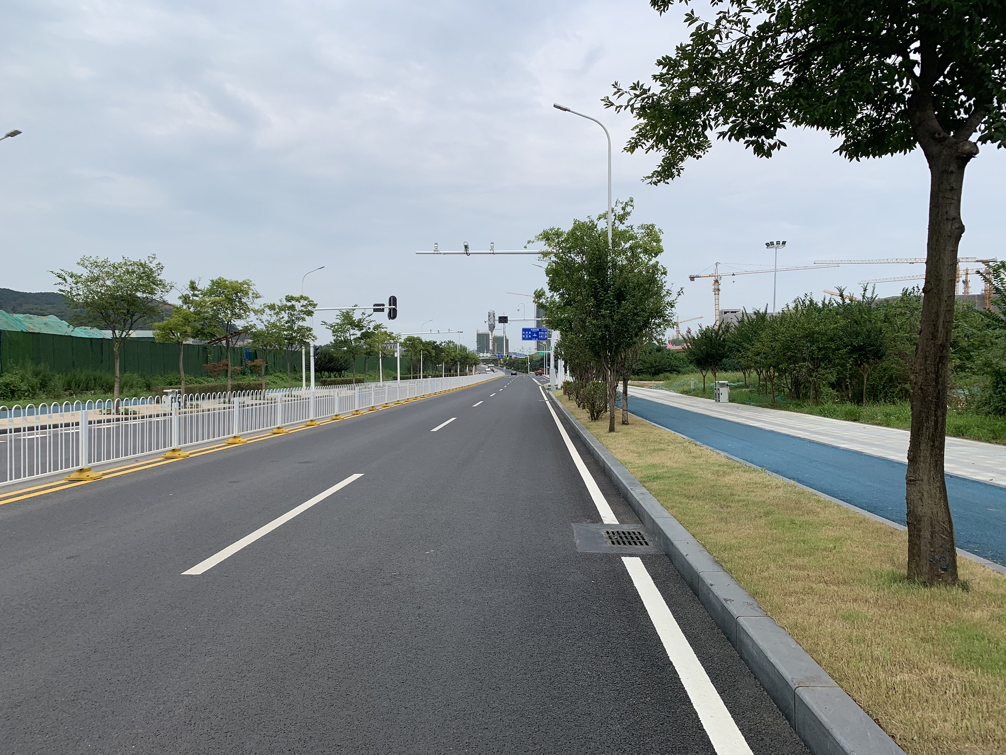 人行道鋪裝面整體采用芝麻灰花崗巖石材。設置特色芝麻黑條形裝飾帶、芝麻黑盲道,保證縫寬一致、線型直順、平整、美觀。非機動車道加鋪光谷藍彩色瀝青,不僅耐高溫、耐磨、抗滑,同時具有低碳環(huán)保的特點,形成一道亮麗的風景線。