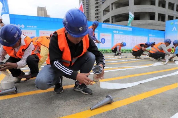 參賽人員組裝2段5m消防水帶及水槍頭。在拼接過程中,要求水帶連接接頭牢固,未出現(xiàn)打結,通過規(guī)定動作,讓農(nóng)民工熟練掌握用水源滅火的方法。
