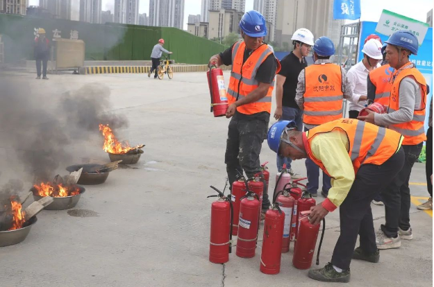 現(xiàn)場擺放有失效和合格的滅火器,參賽人員通過辨識,挑選合格滅火器,按照一搖二提三拔四瞄五壓步驟,在指定區(qū)域進行滅火。