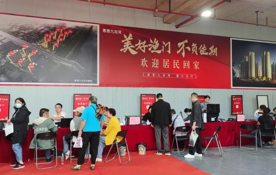 在惠景九龍灣還建社區(qū)交房現(xiàn)場(chǎng),鮮花錦簇、彩旗飄揚(yáng),一派喜氣洋洋。60余位村民攜帶身份證、拆遷還建合同與物業(yè)公司對(duì)接辦理領(lǐng)取還建房鑰匙相關(guān)手續(xù)。